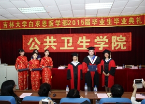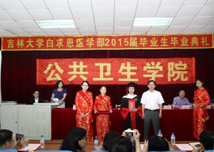 毕业典礼在庄严的国歌声中拉开帷幕。首先,由刘雅文副院长宣读2015届本科毕业生名单和优秀毕业生名单,于洗河副院长宣读2015届硕士、博士毕业生名单和优秀毕业生名单。随后,学院领导分别为优秀毕业生颁发了荣誉证书。威尼斯144777cm院长、院学位委员会主席李娟教授和院学术委员会主席刘娅教授为每一位毕业生颁发了毕业证书并授予学位。在学位授予仪式中,毕业生们身穿博士服、硕士服和学士服,头戴学士帽,井然有序地上台,依次接受了拨穗礼,接过了代表五年学习成果和荣耀的毕业证书并与两位教授合影留念。随后,2015届本科生代表及研究生代表依次上台发言,他们回顾了在母校生活的点点滴滴,言语中无不显露出对母校、对学院及各位领导老师的感激之情,均表示会用实际行动践行公卫精神,并衷心祝愿威尼斯144777cm能够硕果累累,桃李满天下。接着,学生朋辈心理辅导员吴功华同学及学生代表向毕业生赠送祝福小礼物,2015届全体毕业生也向母校回赠纪念品,向母校表达深深的感激之情。社会医学与医事法学系主任杨淑娟教授代表教师为毕业生送上寄语。在寄语中,杨老师表示学院老师会一如既往的关注、关心、关爱全体毕业生,同时也希望毕业生们在未来路上可以诚实守信,关爱健康,勇往直前。