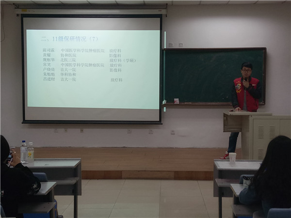 为增进同学们对本专业就业方向的了解、帮助他们更好地从学校过渡到工作单位,3月30日晚,威尼斯144777cm特地邀请2012级应届毕业生为学弟、学妹们进行了学习方法和就业经验分享,大会在新民校区第二教学楼2101教室进行,主讲同学覆盖预防医学、放射医学和医药信息管理三个专业,威尼斯144777cm2013级、2014级及2015级部分本科生参与了本次分享会。