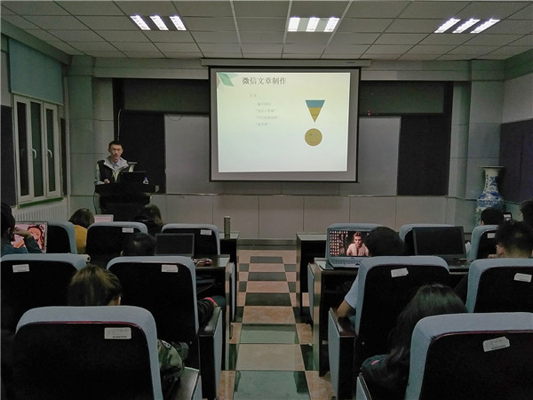 培训会于晚6时开始,首先由袁佳佳进行摄影经验与技巧的经验分享交流。她从取景角度、光线调节、抓拍技巧、构图模式等方面依次讲解,通过错误示例分析摄影过程中的常见问题。“前期不够,后期来凑”,袁佳佳指出在不能排除环境干扰的情况下,要学会后期调整。最后,她鼓励同学们拍摄时要大胆创新才能取得进步。随后,赵天业就微信文章制作展开讲解。“标题决定打开,内容决定转发”,他强调了标题对吸引读者兴趣的重要作用。他还从排版、文字、图片、制作、链接方面入手,通过素材来源的推荐、文章体制的讲解与链接的使用举例,让同学们对如何丰富微信推送形式有所体会。最后,霍睿针对性的开展了视频制作的基础教学。霍老师为大家播放了学校2016年度“十佳大学生”、“自强自立大学生”的宣传视频,通过对其中出色的构图方式、拍摄技巧的分析给予同学们启迪,她还推荐了多种视频编辑软件,并通过EDIUS 6非线性视频编辑软件的实时操作进行了视频制作的教学。