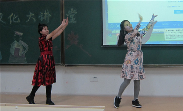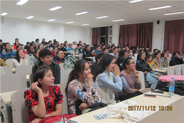 18时30分,活动正式开始。现场座无虚席,同学们都期待着主讲人的精彩演讲。首先,2017级赛比娜·迪丽夏提同学为大家讲解了维吾尔族特有的服饰、美食和建筑,她讲解地认真、细致,将服饰的特点详尽地展示在大家眼前,馕、茶、烤肉等美食也令人垂涎欲滴。接下来,2017级迪丽亚尔·艾尼宛同学介绍了维吾尔族的风俗习惯和传统节日,其间阿依努尔和玛依努尔同学还带来了一段精彩的维吾尔族舞蹈,二人配合默契,舞姿优美。同为2017级的麦和苏坦·图尔荪同学,为大家介绍了维吾尔族的文化和体育,并重点讲解了维吾尔族的足球运动的发展和佳绩,她动情的讲解赢得大家热烈的掌声。最后,赛比娜同学对本次活动做出总结,并呼吁同学们摒弃世人对维吾尔族的误解,重新了解新疆。