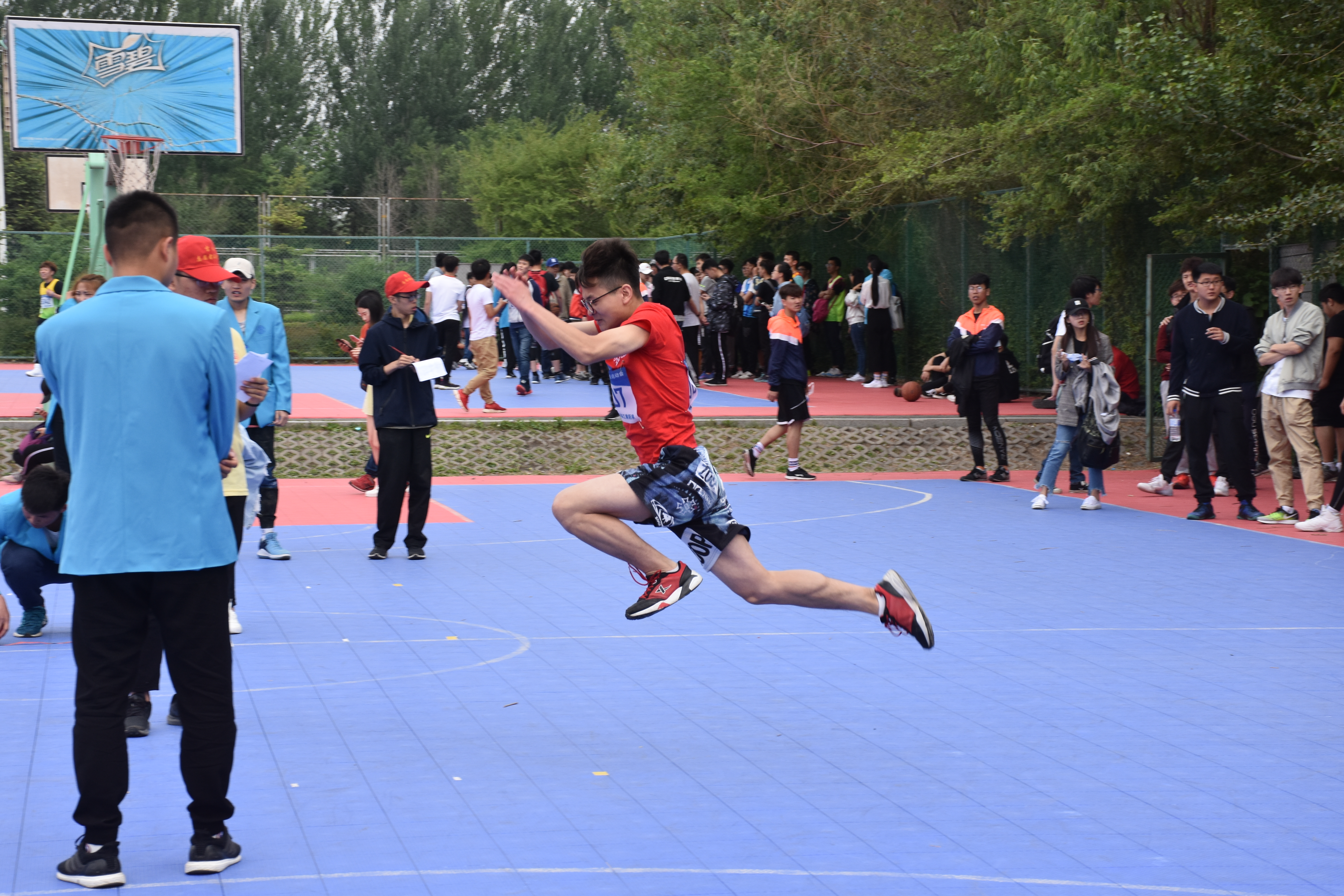 如此炎热的天气并未让参赛运动员畏惧退缩,相反,他目光坚毅,顾不上自身的疲惫与劳累,昂着自信的头,带着必胜的信念走向了起跳线。随着裁判员的号令,男子立定三级跳决赛正式开始。何双双同学沉着冷静,丝毫不受外界环境的干扰,三次跳远全部一次成功,没有任何失误。凭借着优异的表现,他最终获得了8.21米的好成绩,不仅为自己也为学院争得荣誉。虽然只是轻轻一跳,可那跳起的一刻仿佛时光都停住,运动健儿的勇气震撼着每一个人的心灵,在观众心中留下了永恒的瞬间。竞技比赛虽有名次之别,但运动员为学院争光的那一颗热忱之心却并无高下之分,他们为比赛所付出的努力、挥洒的汗水将被永远铭记。