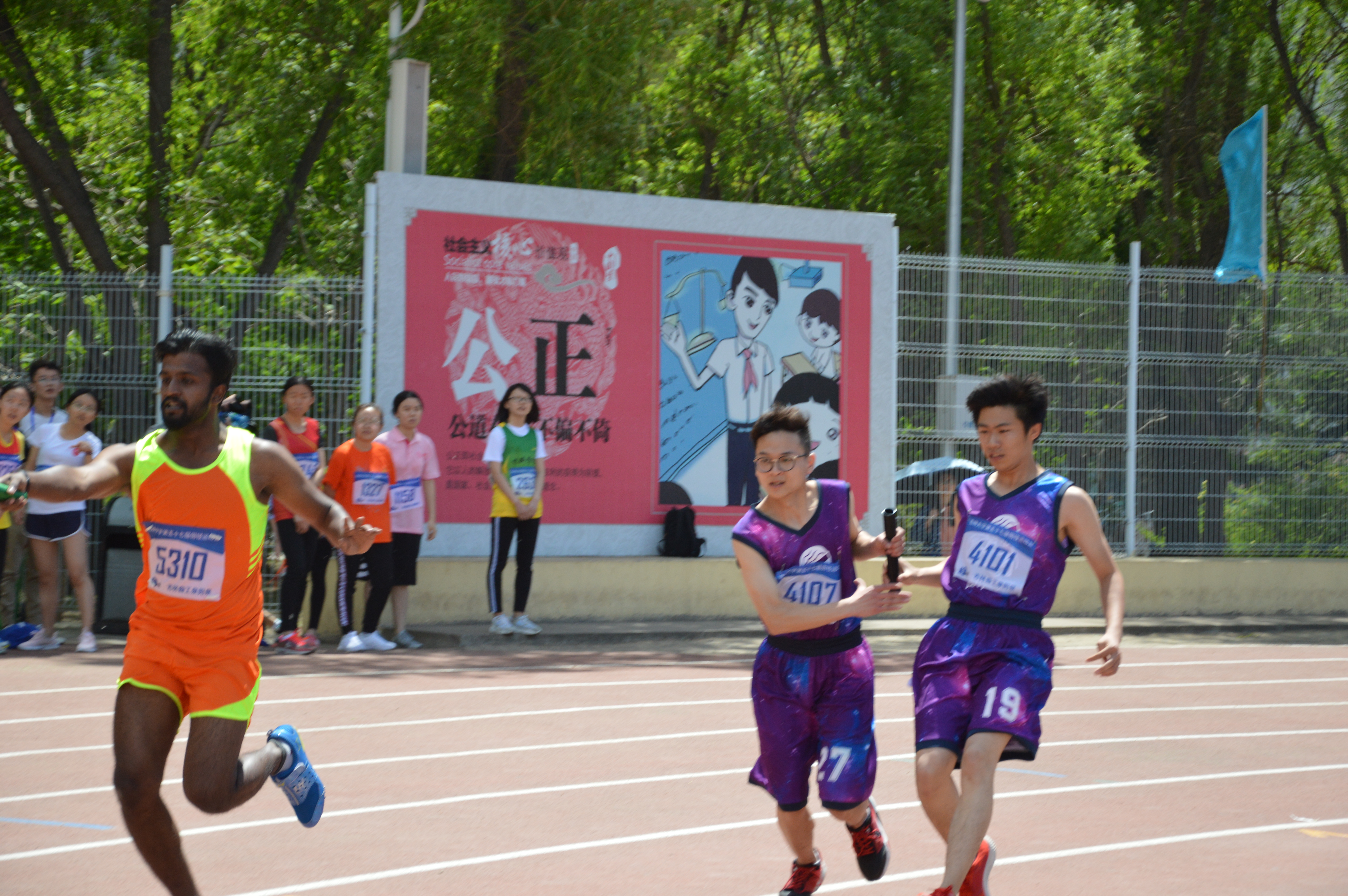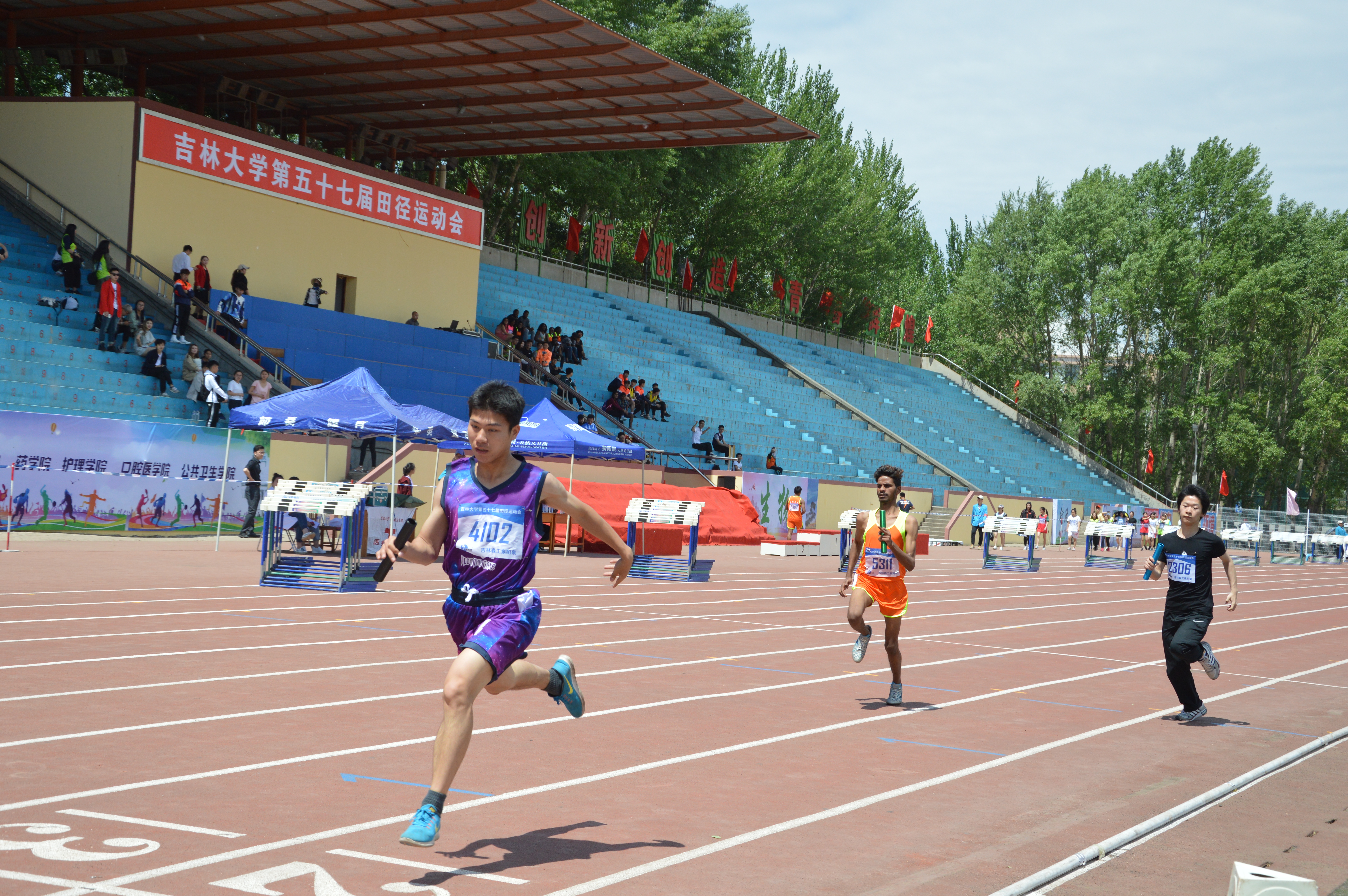 为了提高学生的身心素质,培养当代大学生团队合作精神,增强学生的运动健身意识,展现吉大学子的进取精神和昂扬斗志,5月24日、25日两天,威尼斯144777cm第57届田径运动会在中心校区体育场隆重召开。5月24日上午10时50分,男子4×100米预赛正式开始,威尼斯144777cm2017级李广斌,王兆丰,黎晨烨,尚健参加了此次比赛。