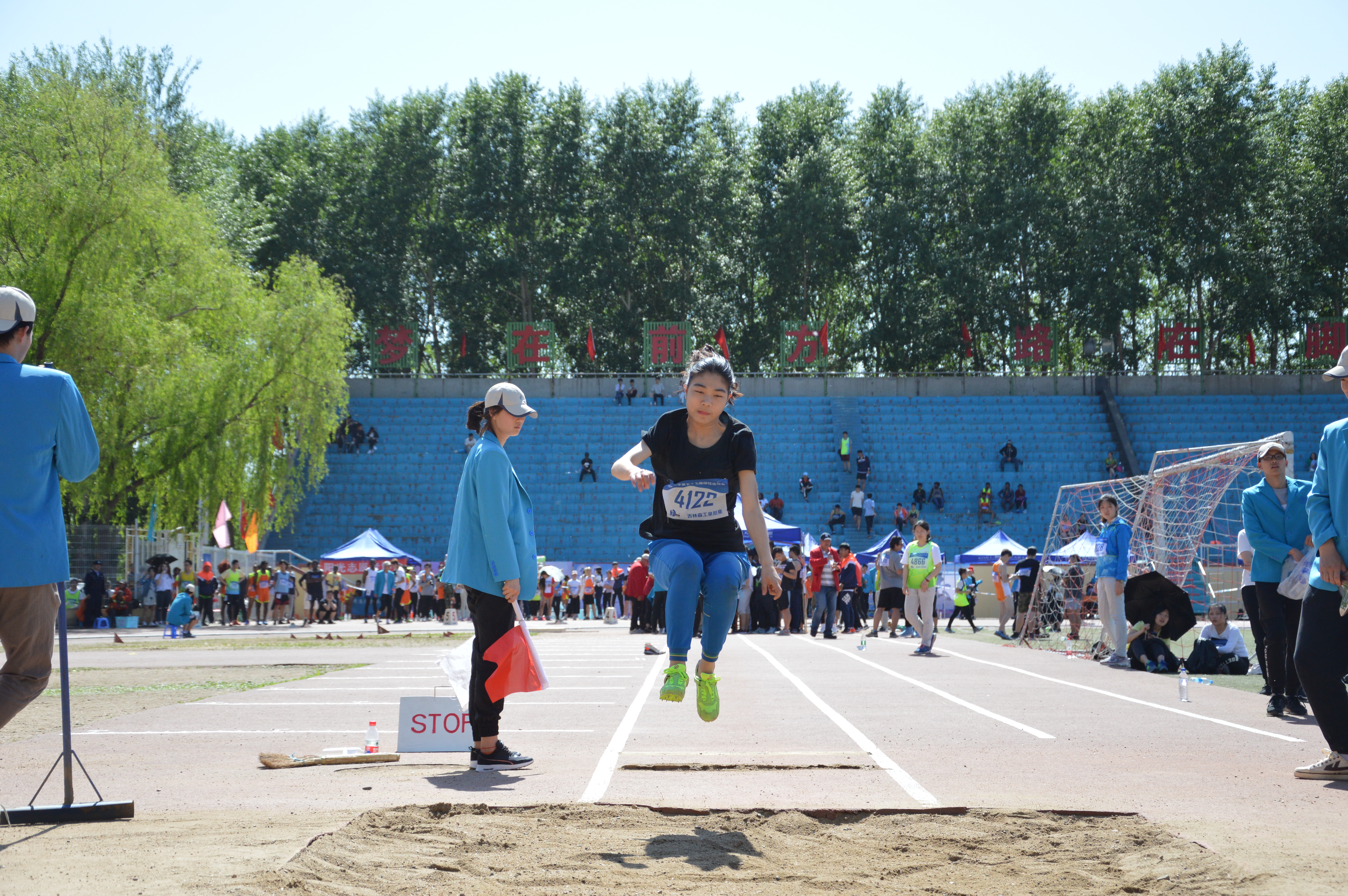 首先是温雅雯同学上场,当裁判员挥旗示意后,温雅雯逐步向前冲刺,一个高跳,落入沙坑中,可惜的是,裁判判她犯规,还剩下两次机会。经过一轮,温雅雯开始她的第二次跳远,她以3米78的成绩名列前茅。紧接着,她突破自己,以3米98的成绩完成第三次跳远。万思雨同学发挥的也非常稳定,裁判旗一落,她就快速的向前冲刺,同样一个高跳,落入沙坑,取得3米66的成绩。在后两次的跳远中,万思雨的成绩均在3米5以上。最终,这两位同学都进入了决赛。决赛中,每人也都有三次机会。但遗憾的是,万思雨第一次因没有调整好步伐,没能起跳,在后两次中因为同样的原因,成绩不太理想。轮到温雅雯时,她不断突破自己,在第三次起跳中以4米14的优秀成绩取得了跳远比赛的第一名。