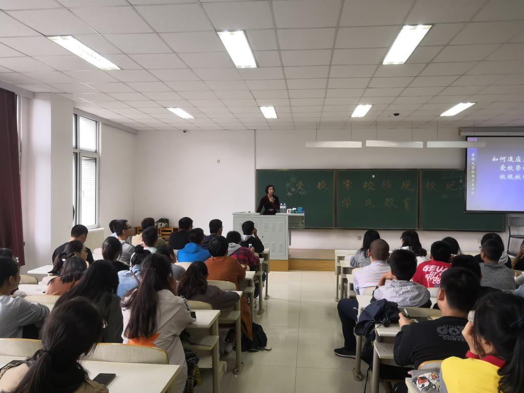 秋风飒爽,威尼斯144777cm2018级新生们即将正式进入到大学生活,为让新生们明确大学目标、更好地规划大学的学习和生活。8月29日,威尼斯144777cm在中心校区李四光教学楼204教室开展2018级新生“爱校荣校”校规校纪教育大会,威尼斯144777cm党委副书记兼副院长、2014级辅导员刘丽担任主讲人。
